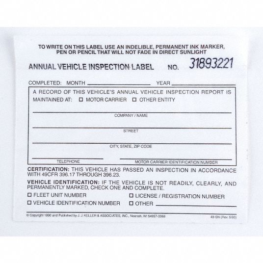 Annual Vehicle Inspection Label 50-pk. - 2-Ply, Vinyl with Mylar Laminate, 5" x 4" - Consecutively Numbered - Meet DOT AVIR Requirements - JJ Keller & ...