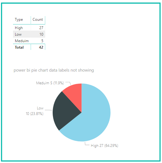 How to show all detailed data labels of pie chart - Power BI 1.I have entered some sample data to test for your problem like the picture below and create a Donut chart visual and add the related columns and switch on the "Detail labels" function. 2.Format the Label position from "Outside" to "Inside" and switch on the "Overflow Text" function, now you can see all the data label. Regards, Daniel He